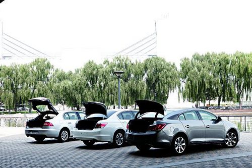 因为在君越的行李厢中有音响和空气净化器等装置的凸出部分,所以虽然看上去绰绰有余,但在实际使用中不免给人带来一些麻烦,就像我们今天准备的道具,君越只能装下1个,但除此之外的空间还足以放下一些随行背包、球杆等物品。再来看看雅阁,它的行李厢可以说还是比较充裕的,放下2个道具箱之后,周围还可以填充下更多的小体积物品,总体来说很理想。在这个环节表现最出色的非昊锐莫属,由于采用两段式可掀背行李厢,所以它所能承载的道具箱达到了4个之多,对此我感到很是惊讶。
