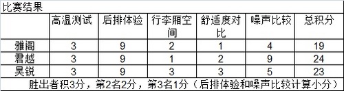 在完成了五项全能的测试之后,让我们来计算一下各位选手的得分情况,胜出者积3分,第2名2分,第3名1分。在第1轮的高温测试中,暴晒60 min钟后,全力开启空调后,3辆车的降温均为5℃,很显然平局。第2轮后排体验,我们以最客观的尺寸数据决定分数,最终结果平分秋色。第3轮行李厢空间较量,依旧是昊锐占据优势,以装载4个纸箱获胜。第4轮舒适度对比,昊锐又一次以洒水最少战胜对手。第5轮噪声比较,别克Quiet Tuning静音技术帮助君越扳回一城。最终结果一目了然,君越以24分力压两位劲敌。