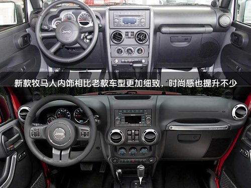 新款Jeep牧马人采用了全新的仪表板以及中控台设计,豪华性和各级感上增色不少。在内部空间上并没有任何变化,为后排乘客提供94.5厘米的腿部空间,后排座椅采用60/40分开式设计,易于折叠放平,从而提供比以往牧马人更大的总体存储量。在地板下面新设计的存储区域可以将私人物品存放在看不到的地方。