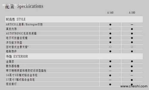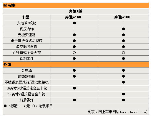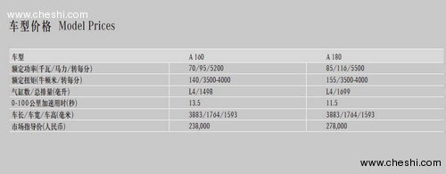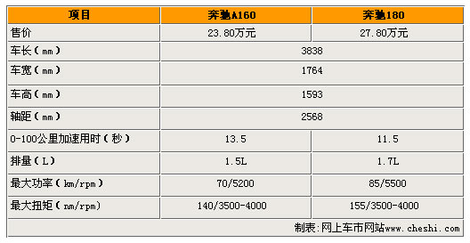 奔驰本次主推两个款型,A160和180,其售价为23.98万元与27.8万元。A160为1.5L拥有140nm扭矩与70kw的最大功率。A180为1.7L 发动机,最大功率85kw,最大扭矩155nm。在外形发面,奔驰A级车的长宽高分别为3838mm、1764mm和1593mm,较奔驰B级车4273mm的车长、1777mm的车宽和1603mm的车高略有缩短。 安全性与娱乐性