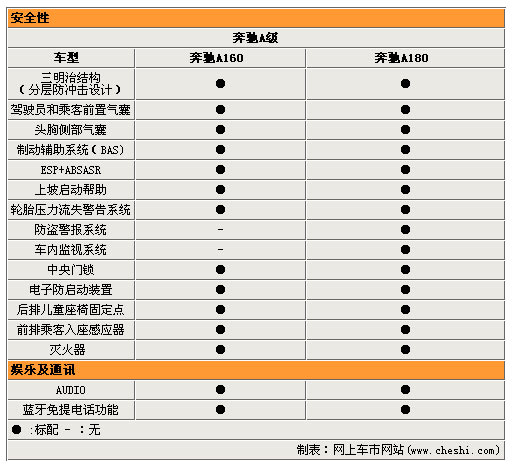 奔驰A级两款车型都同时配备了分层防冲击设计、驾驶员与乘客的头胸侧部安全气囊,使得奔驰A级轿车更加安全。ESP、ABS、ASR三个稳定座驾系统,让驾驶者在日常行驶中更加舒畅,灵巧。在奔驰A180上还配备了车内监视系统,让您可以完全放心自己的爱车停在任何地方。