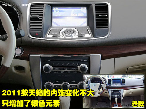 在内饰方面,新天籁的中控台与老款相比没有明显变化,按键错落分明,布局合理。大尺寸液晶显示屏幕放置在正中间,集合了NAVI卫星导航、DVD及倒车影像功能。控制台做工精致,人性化的角度让你不需低头便可操作。三个圆形自发光仪表盘,简洁大方、清晰易读。