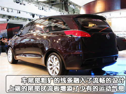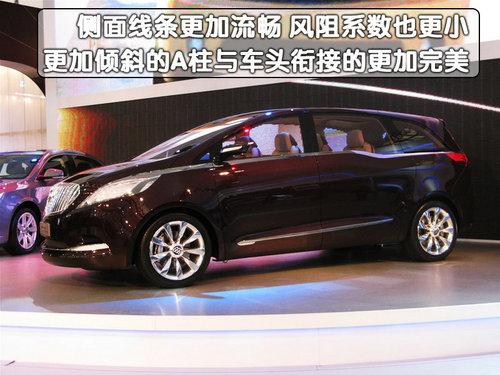 从侧面看,别克新一代GL8的线条更加流畅,风阻系数也更小,更加倾斜的A柱与车头衔接的更加完美。与现款车型一样,前门采用了外拉式开启方式,后门则是采用了后滑轨式的开启方式。同样车尾部粗犷的线条中充分融入了流畅的设计线条,后尾灯的造型更加精致,边缘的尖角设计给尾部增添了不少的活力。后尾门的造型没有概念车那么圆润,但是上端的尾部扰流板是现款车型上没有的,也为MPV车型增添了少有的运动气息。