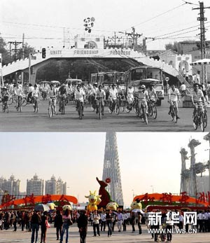 从1990年到2010年,从北京到广州,20年沧桑巨变,见证的是圣火,辉煌的是中国。20年前,可爱的“盼盼”在首都北京迎接亚运圣火第一次点亮神州。20年后的今天,动感活力的“五羊”在广州迎接四海宾朋共同见证一届精彩成功的亚运。上图:1990年8月27日,北京东单十字路口的过街桥装饰一新,第十一届亚运会吉祥物“盼盼”正翘首盼望远方的朋友新华社记者黄景达摄下图:人们在16届亚运会开幕式场地海心沙的祥和如意乐洋洋雕塑前参观(11月10日摄)。新华社记者燕雁摄
