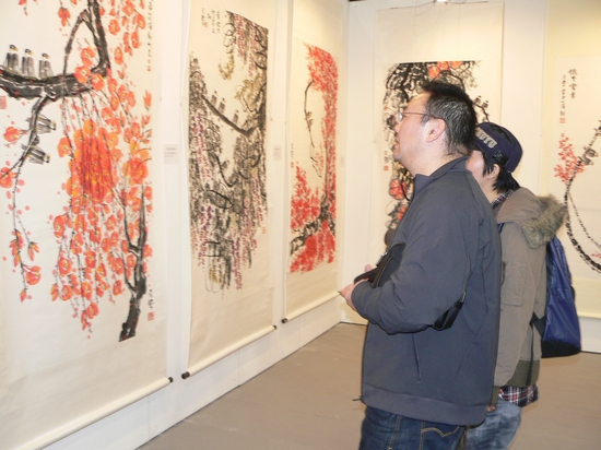 据了解,参加本届西湖艺术博览会展出的是周天黎先生近作,以“红尘浪里、 孤峰顶上”为主题,由我市长乐镇周天黎美术馆提供,其中包括《创世的梦幻》、《寒冰可燃》、《孤卓立大野》、《凌霄花露浓》、《春潮》等15幅书画代表作,成为本届西湖艺术博览会中的一大亮点。展出期间,吸引了来自国内外书画界名流纷纷慕名前来观赏,我市许多书画爱好者也前往参观。新华社、浙江电视台等国内主流媒体在西湖艺术博览会开幕当天就作了专题报道。图为书画爱好者正在观赏画展。