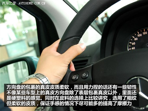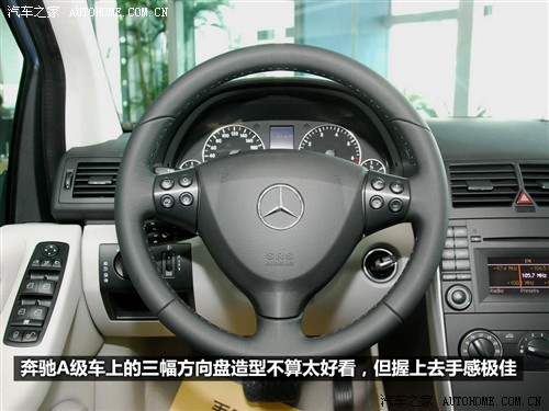 真皮方向盘这个配置现在是越来越普及了,从售价不到10万元的廉价小车到上千万的奢华座驾几乎一半以上的车辆配有真皮方向盘,但手感则千差万别。奔驰A级的真皮方向盘的握感编辑个人觉得非常出色,在目前国内20-30万元价位的车型中,能做到这样手感的,的确不多。其手感比雅阁、凯美瑞、新领驭、君越等这个价位的主销车都更好。