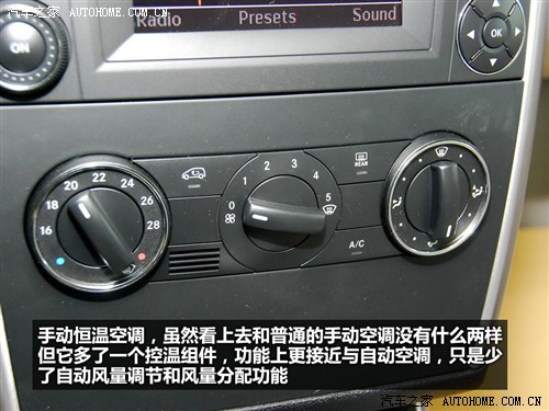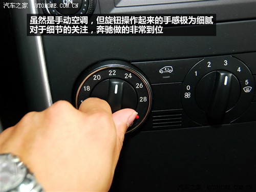 奔驰A级的手动温控空调,是一个让人很纠结的配置。虽然从实际使用上来看和自动空调没有太多本质的区别,同样具有温控功能,只是少了风速与风量的自动分配功能。而且它虽然只是手动空调,但细致程度丝毫不减,旋钮的手感也一如既往的细腻,阻尼感恰到好处。但对于一台奔驰而言,手动空调看着让人觉得总不是滋味。也许我们要改改奔驰在心目中的地位了,毕竟眼前的这台是“小奔”,而非“大奔”。