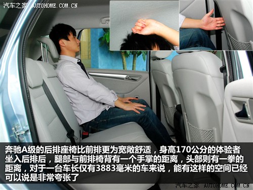 奔驰A级的后排空间表现比前排更令人满意,正常身材的乘客坐入后排之后,无论头部还是腿部都不会有任何压抑的感觉,甚至可以说是空间宽敞。同时,编辑在这里需要提醒大家的是,奔驰A级是一台车身长度比飞度还短的小型车哦。