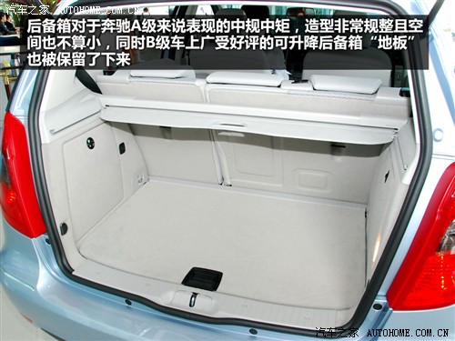 奔驰A级的后备箱没有太多亮点,造型非常规整,而且空间也不算小。最重要的是它保留了奔驰B级车上那广受好评的“地板”升降功能,进一步增强了该车后备箱的实用性。