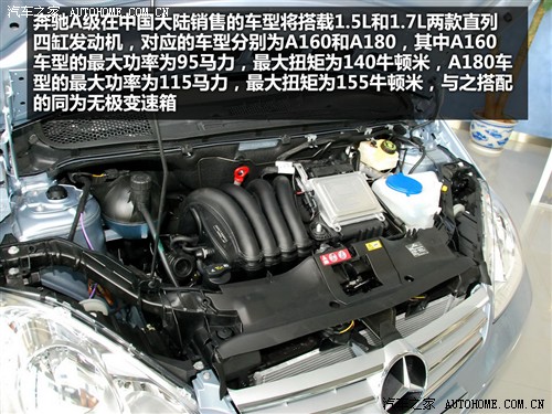 目前我们已知将首批进口到中国大陆市场并销售的奔驰A级车共分两种排量,两款车型。分别是搭载1.5L排量发动机的A160和搭载1.7L排量发动机的A180,与之搭配的都是一台无极变速箱。而在配置方面,奔驰A180会明显高于A160,如主动式停车辅助系统、真皮座椅、座椅电动调节和17寸铝合金轮毂等这些在A160上没有的配置,在A180上都会成为标配装备,至于百叶窗式全景天窗,则很有可能会出现在选装表中。