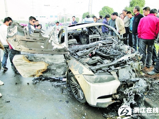 据参与救援的义乌消防官兵介绍,两车相撞后,宝马又继续向前行驶了100米左右,随后撞上路边的花坛并迅速起火,火从车头燃起,火焰足有4米高,整个灭火过程持续了5分钟。