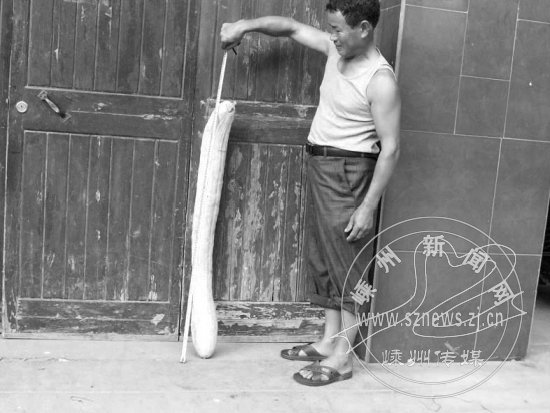 石璜镇楼家村楼宇钦从地里收获的一个南瓜特别细长,重量7公斤,长度为105厘米,比五六岁的小孩还高,引来不少村民观看。