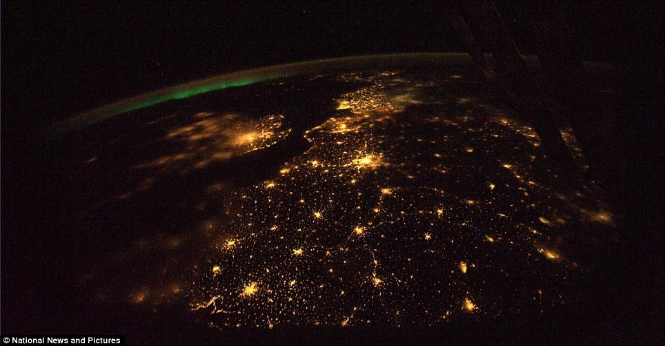 从这张美丽的欧洲夜景图上,可以看到远处的绿色北极光。多佛海峡清晰可见,它就靠近巴黎——光之城,不过英格兰和伦敦西部上空有少量雾霭。