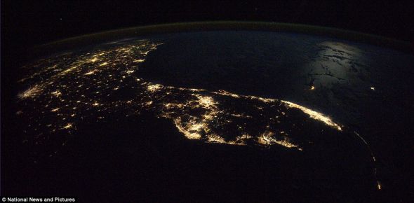 这是晴朗秋夜的佛罗里达半岛和美国东南部夜景,月光散落在水面上,夜空充满无数繁星。