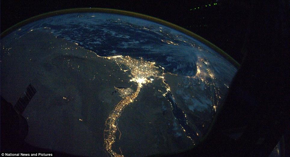 非洲北部荒凉的沙漠无人区与住满人的尼罗河沿岸地区形成鲜明对比。较远处是美丽秋夜中的地中海东部地区。