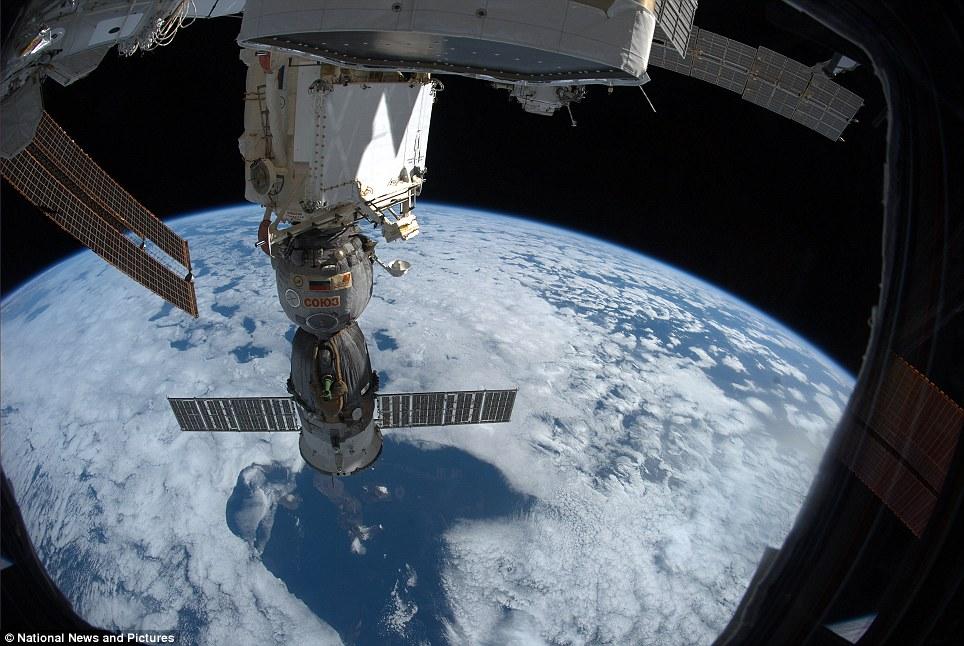 这是太空里一个独一无二的奇幻时刻。从“圆顶(Cupola)”观测舱向外看,可以看到将要带指令官惠洛克回家的那艘飞船。从下面裂开的云缝里,可以看到加拉帕哥斯群岛。