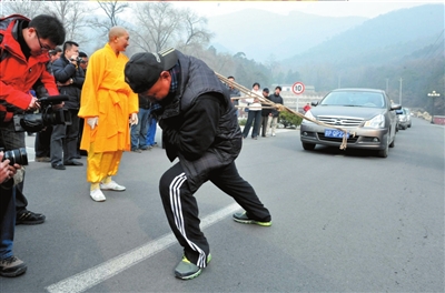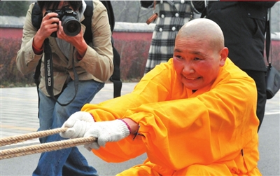 传奇女僧人徒手拉6辆总重量约9吨的汽车