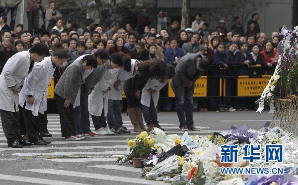 21日一早,前来致哀的上海市民络绎不绝,胶州路百米长的街道上放满了遇难者亲属、群众和社会各界献上的花圈花篮花束,形成了寄托哀思的“花墙”,映衬着“向‘11·15’特大火灾遇难者致哀”黑底白字横幅。上海市领导手持洁白的菊花,缓步走到胶州路728号火灾大楼前,静默肃立。俞正声、韩正等神情凝重,依次向火灾遇难者深深地三鞠躬,走到“花墙”前,俯身献上洁白的菊花。