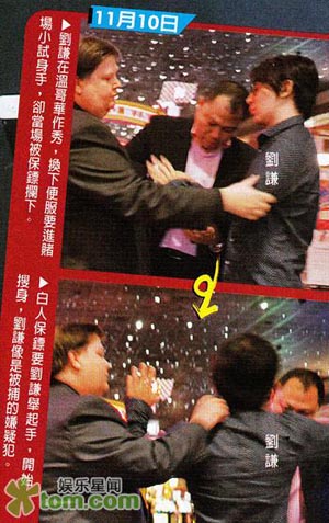 《刘谦变万化之世界巡回演出》11月10日赴温哥华剧场(River Rock theatre)举行两场巡演,演出后他换上便服,欲到赌场小试手气,却被赌场保镖怕他出老千强行搜身,逼刘谦卷起长袖才放行,一脸无奈的模样被其他赌客拍个正着。