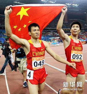 11月22日,劳义(左)在夺冠后与队友郑东升庆祝。当日,在广州奥林匹克中心体育场举行的第16届亚运会男子100米决赛中,中国选手劳义以10秒24的成绩夺得冠军。新华社记者廖宇杰摄