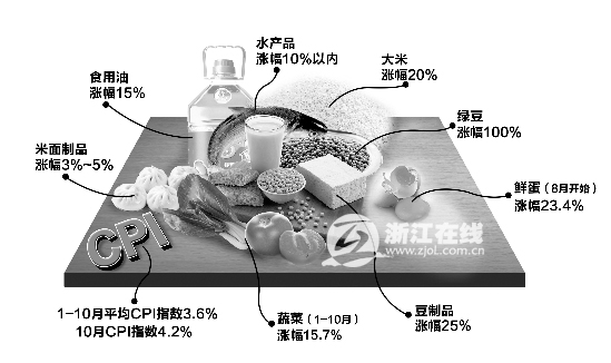 统计信息显示,今年10月份杭州居民消费价格同比上涨4.2%,也是就是说杭州10月份CPI指数是4.2%。而杭州1至10月份平均CPI指数是3.6%。