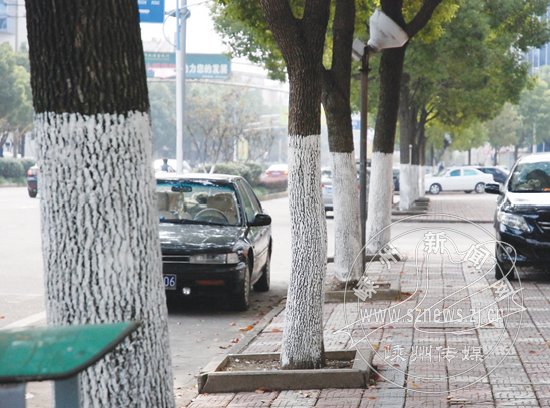 11月22日上午,记者发现官河路两旁的行道树已被园林工人刷上白石灰,就如给行道树添上了一件“新衣”。据了解,此举可以杀死寄生在树干上的一些越冬的真菌、细菌和害虫,同时还能预防树干在寒冷天冻裂。