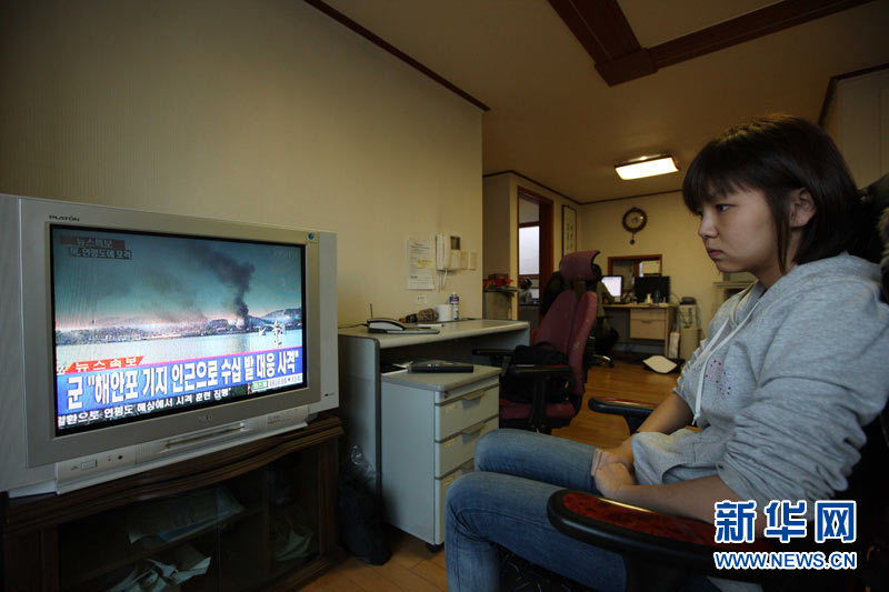 11月23日,在韩国首尔,一名女子在办公室内观看电视上关于炮击的新闻。新华社记者何璐璐摄