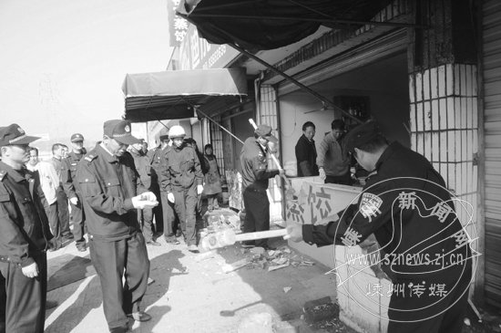 11月11日,市城管执法局鹿山中队会同鹿山街道办、交通局、国土局、电力公司、卫生监督所等相关部门和单位,出动执法人员100余人,动用气割、铲车等工具,对城西入城口客运西站至小砩地段道路两侧实施联合整治。共拆除铁皮棚、破损遮阳棚及乱搭建构筑物670余平方米,拆除店前占道水槽27处,清理立式广告牌18块,取缔店外经营44户、马路仓库10余处,并清除道路两侧的杂物堆积100余处。