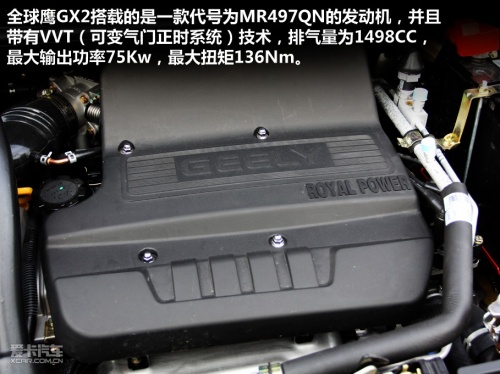 在动力方面,GX2搭载的是一款代号为MR497QN的发动机,该发动机带有VVT技术,排气量为1498CC,最大输出功率75Kw,最大扭矩136Nm。前期匹配的是5速手动变速箱,后期还将搭载4速自动变速箱。