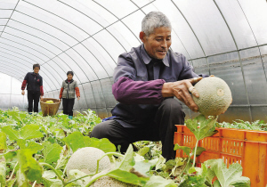 嵊州丰尼果蔬专业合作社丰尼果蔬示范基地是国家农业综合开发项目。该基地通过改良土壤,应用测土配方和喷灌、滴灌、节水灌溉等一系列先进设施,在500多亩的荒坡丘陵酸性黄土地上,种出了杨梅、樱桃、蔬菜瓜果等30多个果蔬新品种。图为11月19日,果农在该基地的大棚内采摘引种的黄金瓜和网纹瓜。【来源:天天商报】