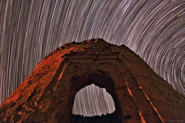 这是这个月拍摄的一张长曝光照片,它显示的是位于伊朗一座古塔遗迹后面的宇宙之轮。这是在奥保兹(Alborz)山用大约3小时拍恒星移动的轨迹,然后合成的,这座山的最南端靠近里海。据摄影师巴巴克·塔弗莱希说,古代天文学家可能正是利用这样的塔来确保历法的精确性。