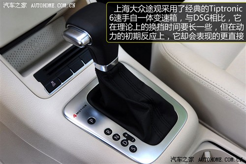 途观并没有时下大众集团主流的DSG双离合变速箱,而是使用了技术成熟的6速手自一体变速箱(AQ250)。对于这一点,编辑还是比较理解的,因为DSG变速箱虽然先进,但技术还不够完全成熟,用在应对苛刻考验的越野车上,还是技术更为成熟的最为稳妥。