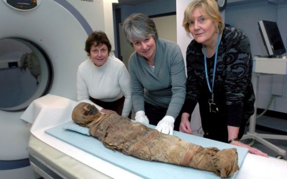 11月20日在阿登布鲁克医院做的CT扫描,在没有破坏木乃伊骨骼的情况下,对他进行了详细研究。放射线专家发现木乃伊的胸前有两个锥形胸衣,手腕上有一个通常女人戴的金手镯。然而,虽然这具木乃伊身上有多处女性装饰,但对骨盆和牙齿的细致分析证实他是男性。(秋凌)