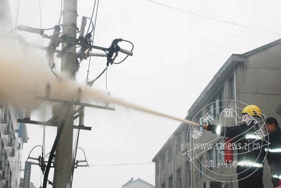 昨日上午,天空不断下着雨,三江北街一台变压器突然冒起火花,消防大队接警立即赶到现场,用灭火器将火扑灭,事故没有造成人员伤亡。