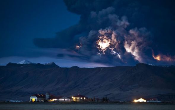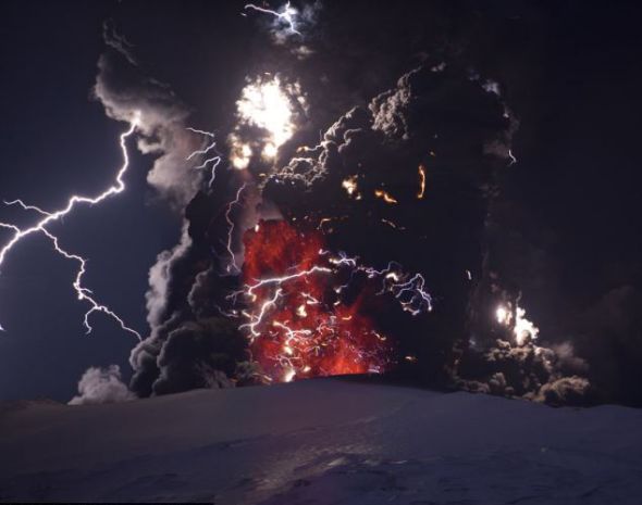 冰岛艾雅法拉火山喷出的大量火山灰里充满闪电。静电在云团里越积越多,最终形成闪电,释放出电荷