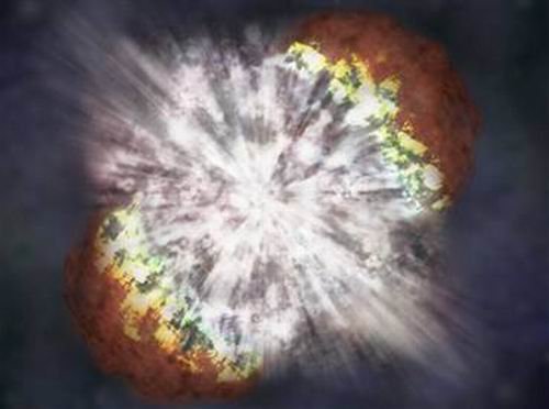 一颗恒星是太阳体积的150倍,它在遥远星系演变成为超新星,许多科学家认为它的爆炸可能性是超大质量恒星的两倍,并且更接近地球。此外,超新星是迄今所观测到拥有更强大能量和最明亮的星体。在此之前,科学家曾认为此类的超大质量恒星很可能会崩溃成为黑洞,或者分解更多的质量,最终成为超密集的中子星。目前,他们知道此类超大质量恒星能以巨热核恒星炸弹的形式变成超新星,这项发现暗示着在银河系内类似的恒星——伊塔星(Eta Carinae)将最终遭遇类似的命运。科学家称,超新星爆炸事件非常明亮,观测者能够较早期地在夜晚观测到超新星释放出的光亮。如图所示,这是超新星SN 2006gy的爆炸过程(最亮超新星)。