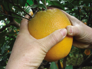 众所周知,脐橙的周长能达到径长30厘米已经不算小了,嵊州市甘霖镇果农高昌华脐橙园的一个脐橙果型却异常大,周长居然达到了40厘米,用两只手才刚好能围拢。记者发现,这个脐橙所在的树结出的果子普遍大于旁边的。高昌华说,这片脐橙园已有五六年了,他是一样的施肥,一样的管理,这棵树之所以普遍结大果,可能是品种变异造成的。