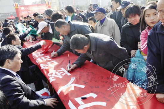 12月4日是我国第十个全国法制宣传日,今年法制宣传日的主题是“弘扬法治精神,促进社会和谐”。我市在文化广场举行了争做学法守法好市民万人签名、现场法律咨询、法律知识有奖答题、法制图板展出和法制文艺演出等丰富多彩的法制宣传活动。同时还为“我为‘六五’普法献一计”金点子获奖者、全省企业法律知识竞赛活动获奖者进行了颁奖,并为获得2009年度省级“民主法治村(社区)”的三界镇南街村、长乐镇福全村、剡湖街道东浦社区进行了授牌。市领导何国英、叶江仁、丁法军参加活动,并为获奖单位和个人颁奖。图为市民签名场景。