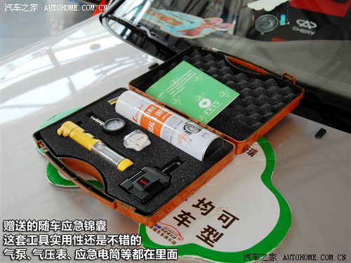 除了少量加装配件和现金优惠外,旗云2金标版还有一个随车应急锦囊赠送。这套工具实用性还是不错的,气泵、气压表、插线口和应急电筒等工具都包含在里面。遇到一些突发事故的时候,这套工具应该会带来一点帮助。