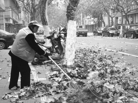 昨日上午,冷空气光临我市,气温骤降。一阵阵寒风吹落了满树黄叶,这可忙煞了环卫工人。