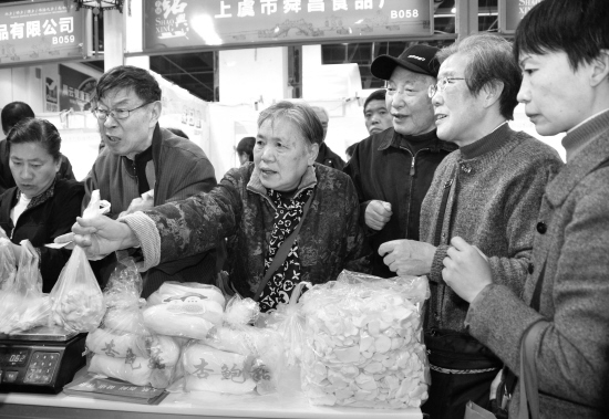 为期5天的浙江农业博览会11月26日在杭州举行,嵊新两地共有20多家农业龙头企业参展。嵊州的花生、糟货、年糕、榨面、牛奶等主打农产品受到杭州市民的欢迎。 (记者 张亮宗 摄)