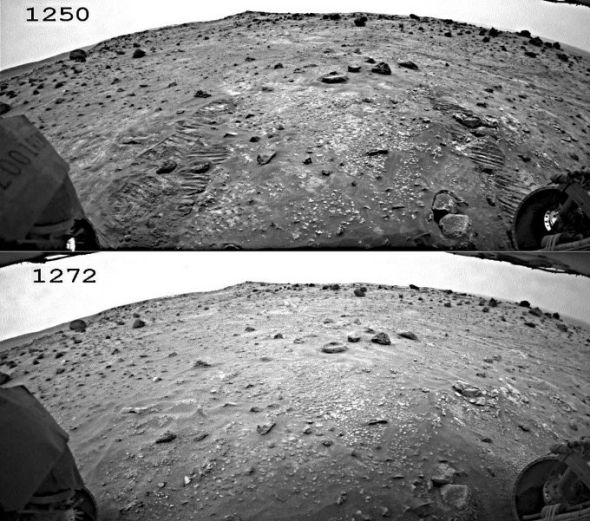 2007年7月,一场波及整个火星的尘暴充分展示了火星大风的破坏力。在等待尘暴消失以前,“勇气”号探测器在大概相当于地球上一个月的时间里一动不动,期间,利用安装在后面的相机拍摄了这些照片。由于风力过大,“勇气”号的相机被灰尘所覆盖。在最上面的那张图,“勇气”号的车辙痕迹非常清晰,但在22个火星日过去以后,它们被完全抹去,取而代之的是从别处吹过来的土壤。