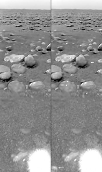 如果“惠更斯”号在这次降雨中幸存下来,它最终可能被埋在由碳氢化合物构成的沙丘中。韦斯特说:“在过去曾有人居住的撒哈拉沙漠部分地区,如今则被沙丘所覆盖。过去数百年,沙丘地带可能不断变化。这一幕或许会发生在土卫六。”迄今,从太空中还未拍到“惠更斯”号的照片,但它却拍了像是自画像的东西。一滴液态甲烷在“惠更斯”号相机遮阳板的边缘凝结,并在“惠更斯”号拍照时出现在相机的视野内。在下图底部,箭头标出了这滴液态甲烷的位置。(孝文)