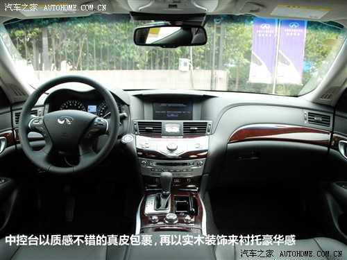 车内的风格跟张扬的外形完全不同,整体显示出豪华轿车那份稳重、有内涵的绅士气质。中控台以真皮包裹并以太木装饰来衬托豪华感,圆润的线条给人以柔和、安逸的感觉。做工精致的传统仪表盘并没有采用运动轿车的炮筒型式,中央空调出风口的石英钟也在时时刻刻提醒你这是一辆行政级豪华轿车。坐在车内想要体验一下强劲的动力感觉很容易,只需将变速杆拨到手动模式并将变速箱旋钮旋转至Sport模式,深深踩下油门,强大的V6发动机将让M37从一位温文尔雅绅士变成一只凶猛的野兽。