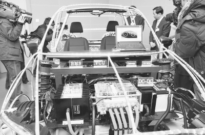 7日上午,一汽-大众汽车有限公司与启明信息技术股份有限公司签订“新能源汽车电子技术联合开发”协议,双方将成立“新能源汽车联合试验室”,在技术合作、产品研发、产业促进等多个层面进行交流合作。这也标志着一汽-大众向新能源汽车进军的步伐提速。图为一汽-大众展出的电动汽车研发平台 记者 宗巍 摄 资料照片