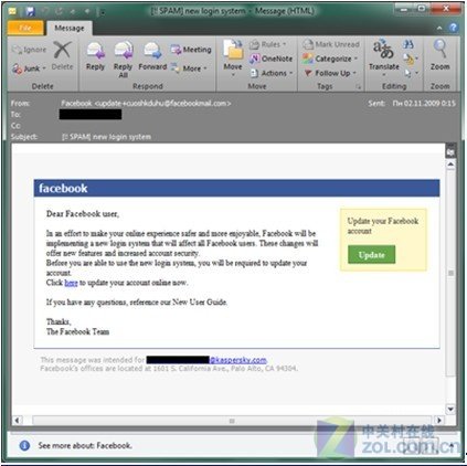 当然,也有些伪造的社交网站的提示邮件并不会要求用户输入用户名和密码,并且这些邮件看上去除了其中的链接外,其他均同真实的邮件100%相似。但是如果用户仔细看一下其中链接的地址,就会看到其将用户定向到的地址并非该社交网站的官方地址。网络诈骗者经常将这些假冒的诈骗网站做得同真实网站非常相似,如假冒的网站会使用http://fasebook.com/,而真实的地址则是http://facebook.com/。