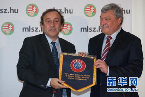 普拉蒂尼表示,国际足联和欧洲足联都愿意开拓新的疆土。为了弥补普拉蒂尼当球员时不能在匈牙利国家队踢球的遗憾,匈牙利足协主席将一件匈牙利国家队的10号球衣赠送给普拉蒂尼。球衣上面写有普拉蒂尼的名字。新华社发(弗尔季·奥蒂洛摄)