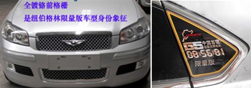 瑞麒G5纽博格林限量版前脸采用全镀铬设计,后三角窗标有纽博格林限量版及成绩贴牌,成为纽博格林限量版车型的身份象征。另外底盘加装了铝合金平衡杆,提高了车辆在行驶过程中的稳定性及平衡性。