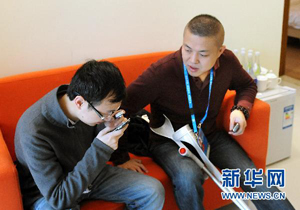 12月12日,解岩(右)在等待高山一同外出采访。在参加亚残运会采访的2400多名媒体记者中,有一个独特的工作团队——“一加一视障人声音工作室”。这个团队由杨青风、解岩、高山和志远四人组成,其中视障者三人,一人为肢残者。相似的经历加上通过努力掌握的专业知识,使他们更能理解到残障人士对实现人生价值的渴望与追求。为了使更多的残障人士尤其是视障者分享残疾人运动员的成功与喜悦,他们受北京一加一残障人文化发展中心的委派,前来采访广州亚残运会。作为全国首个从采访、编制到播出全部由视障者完成的广播节目制作团队,他们制作的广播节目在中央人民广播电台的《中国之声》栏目定期播出,还将通过“一加一”声波网,与全国的视障人士进行交流互动。他们分工明确,有的负责采访,有的负责节目录制,还有的负责外联,工作有条不紊,紧张有序,被同行们称为“用心灵传递声波的使者”。新华社记者王颂摄