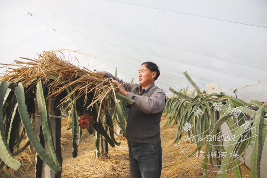 随着气温逐渐下降,近日,市剡江火龙果专业合作社采用双层薄膜、加盖稻草、照卤钨灯等多重保暖措施,确保火龙果顺利过冬。火龙果管理比较简单,但不耐寒。为了让火龙果树安然过冬,合作社对9只大棚采用双层薄膜覆盖,晚上气温低再用碘钨灯加热。这几天气温下降,他们又给火龙果树覆盖了厚厚的稻草。